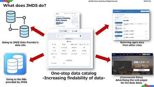 欧州データスペースを参考にしつつ、日本の課題解決(安心・安全、交通混雑の解消等)に必要なデータプラットフォームとしての「Japan Mobility Data Space(JMDS)」の全体像が示された。