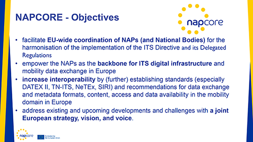 欧州ITS指令を背景に、各国のナショナルアクセスポイント(NAP)の調和を進めるNAPCORE(National Access Point Coordination Organisation for Europe)の活動が紹介された。